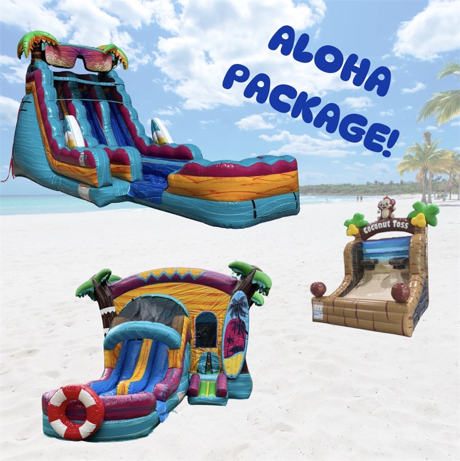 Party Rentals Aloha Package in your area delivers island-style excitement with our 18ft Beach Vibes Slide, Aloha Combo, and Coconut Toss Game. This ready-to-go package creates a tropical scene, keeps kids active, and makes summer parties unforgettable. Fast setup. Safe equipment. Big smiles.
